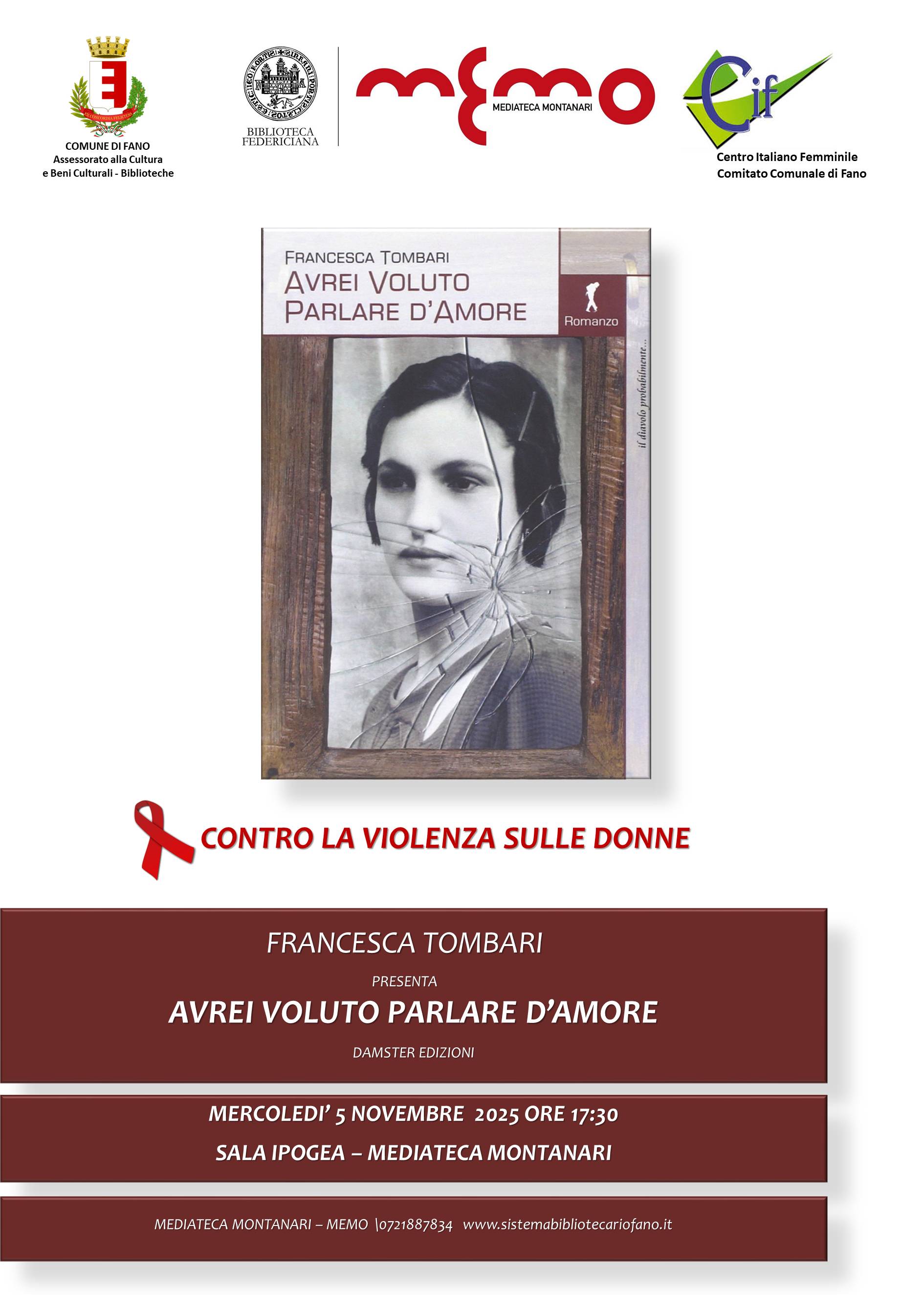 Sarà presente l'autrice Francesca Tombari, in collaborazione con il Centro Italiano Femminile Comitato Comunale di Fano. Contro la violenza sulle donne